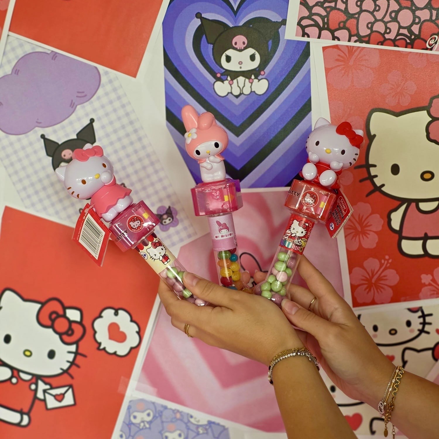 Ils contiennent des stickers Hello Kitty et des jelly beans fruités cachés à la base du tube.